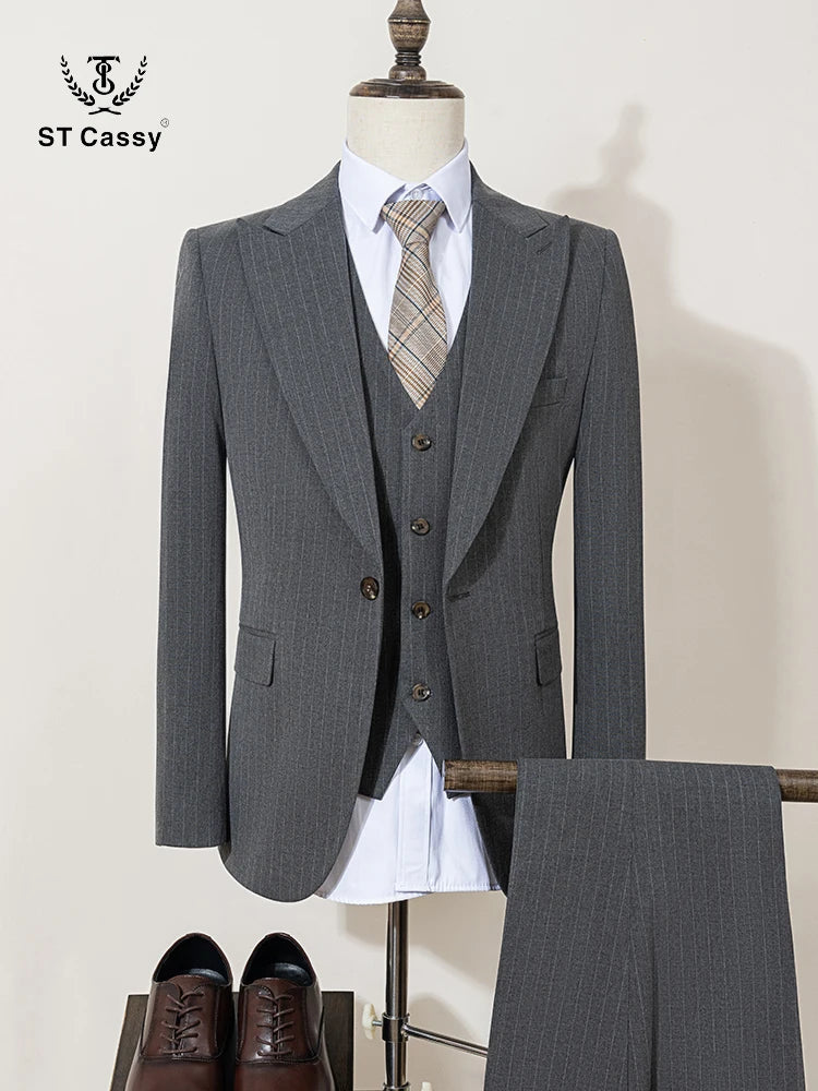 ST Cassy high-quality grey striped suit slim fit luxurious and elegant men's business suit wedding fashion clothing 3-piece set