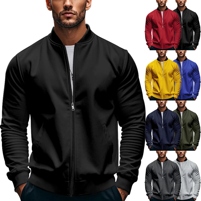 2024 New Spring And Autumn Men's Stand Collar Jacket Solid Color Leisure Sports Long Sleeve Zipper Coat Straight Tube Large Size