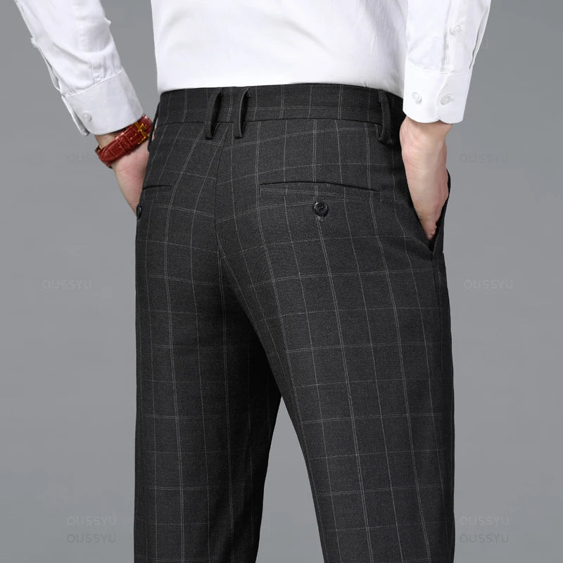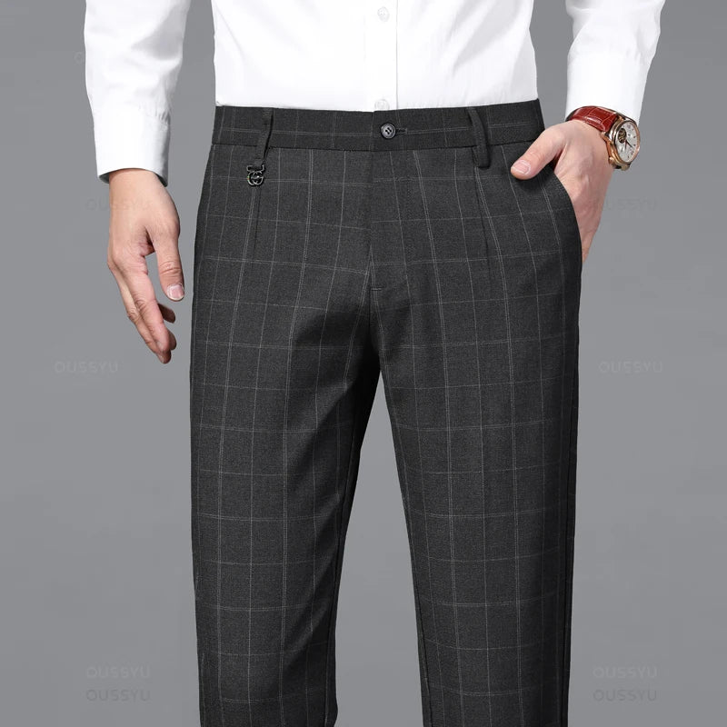 2024 New Classics Plaid Stretch Pants Men Business Fashion Grey Black Casual Pants Male Brand Formal Work Suit Trousers 38