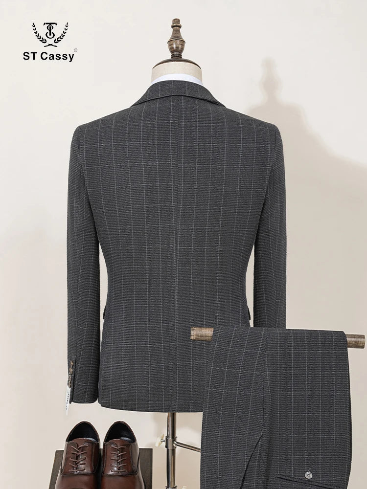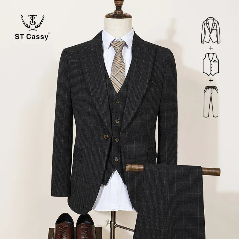 ST Cassy High Quality Men's Plaid suit Slim Fit Male Groom Wedding Blazers evening gown(jacket+Vest+Pants)