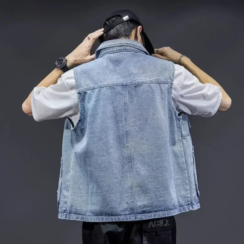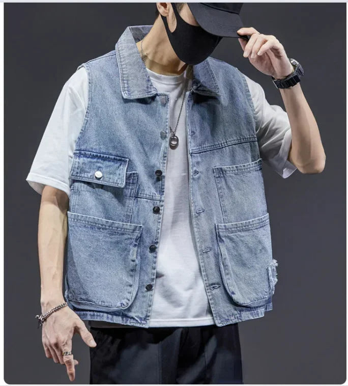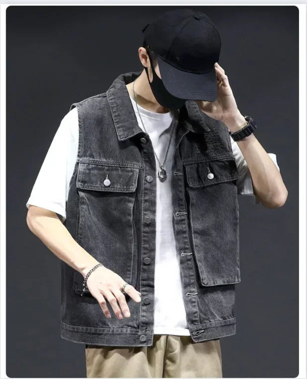Summer 2025 Men's Fashion Denim Vest - Sleevless Solid Jacket with Utility Pockets and Shoulder Straps
