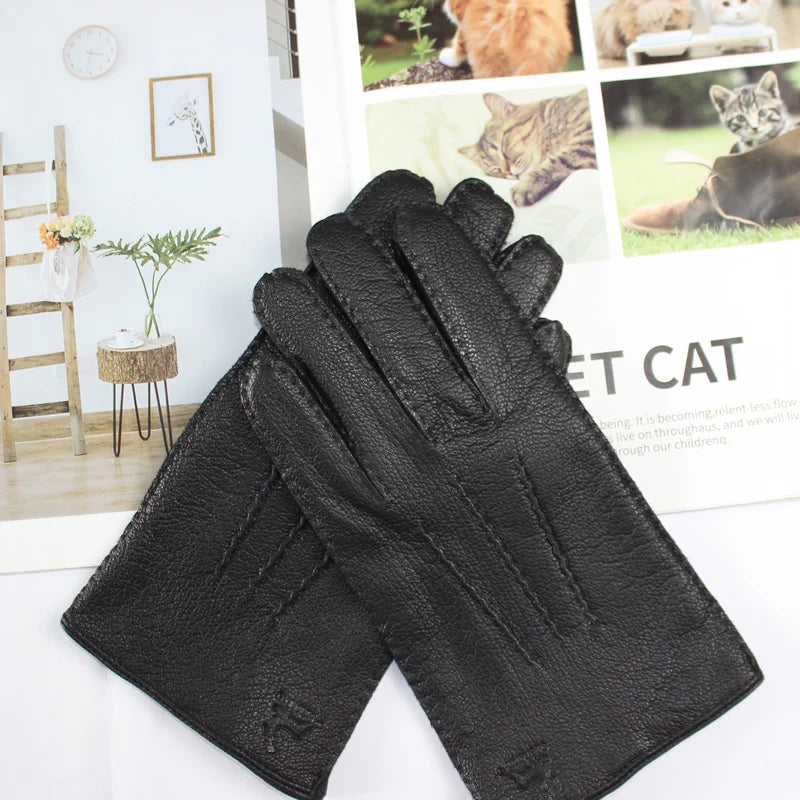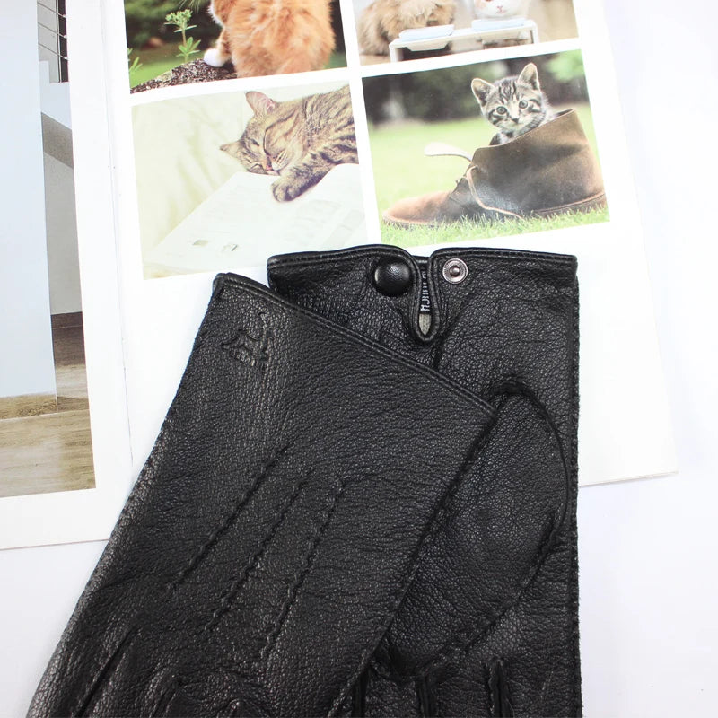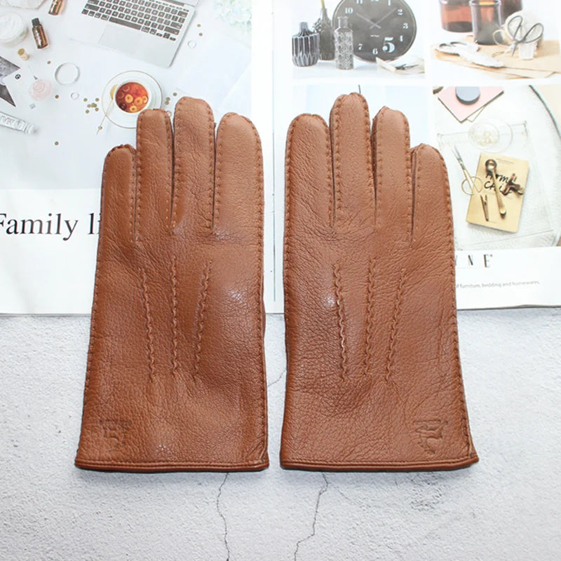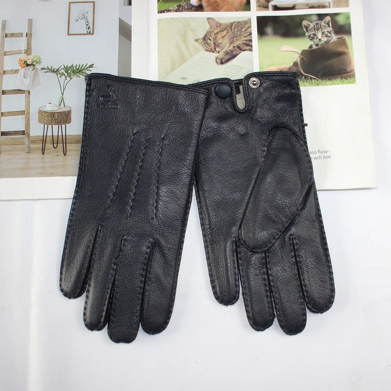 Touch Screen New Men's Deerskin Gloves Leather Fashion Corrugated Wool Knit Lining Winter Warm Driving Gloves Autumn