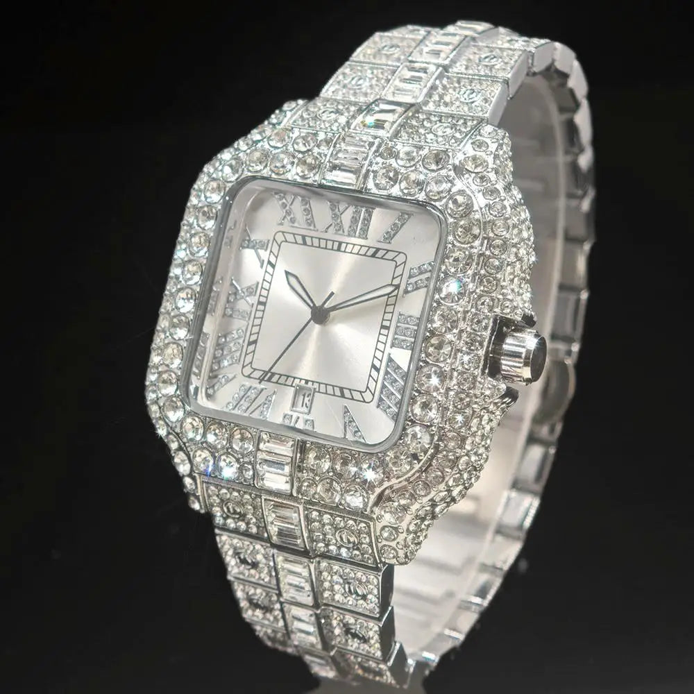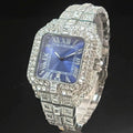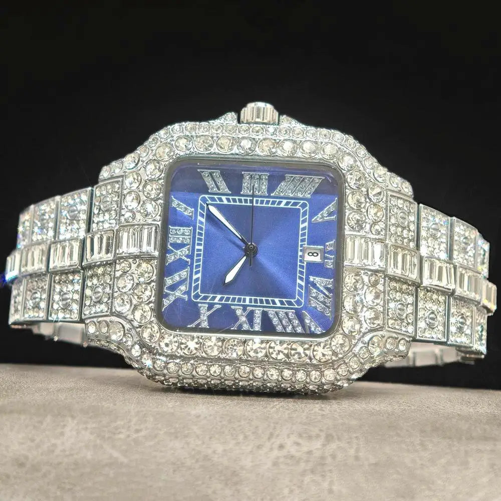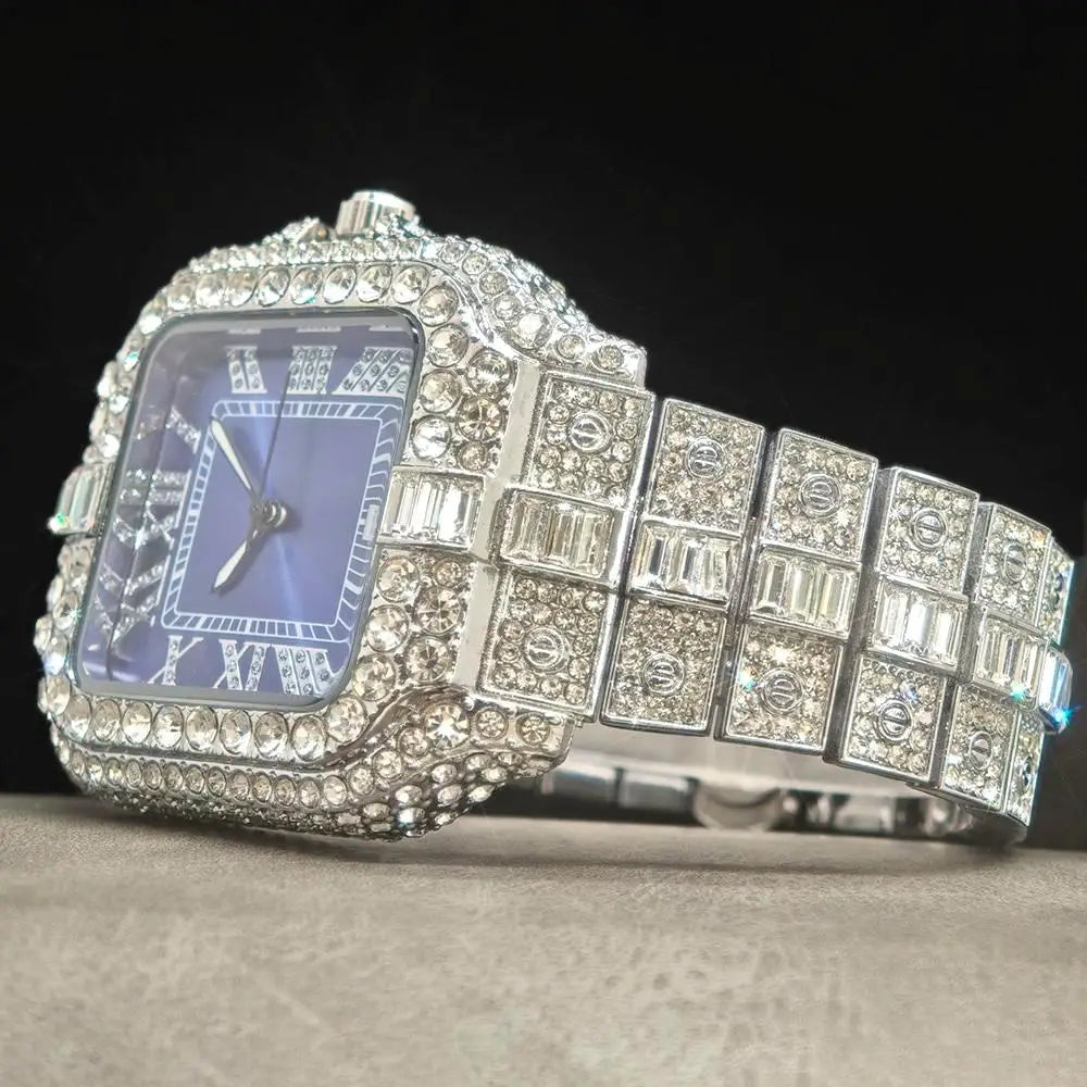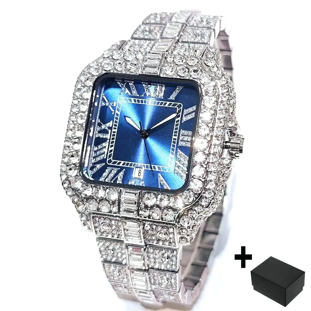 UNIGUET Fashion Blue Watch For Men Hip Hop Ice Diamond Quartz Watch Luxury Roman Literal Square Wristwatch Man Gift Dropshipping