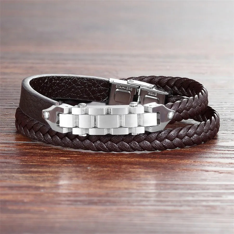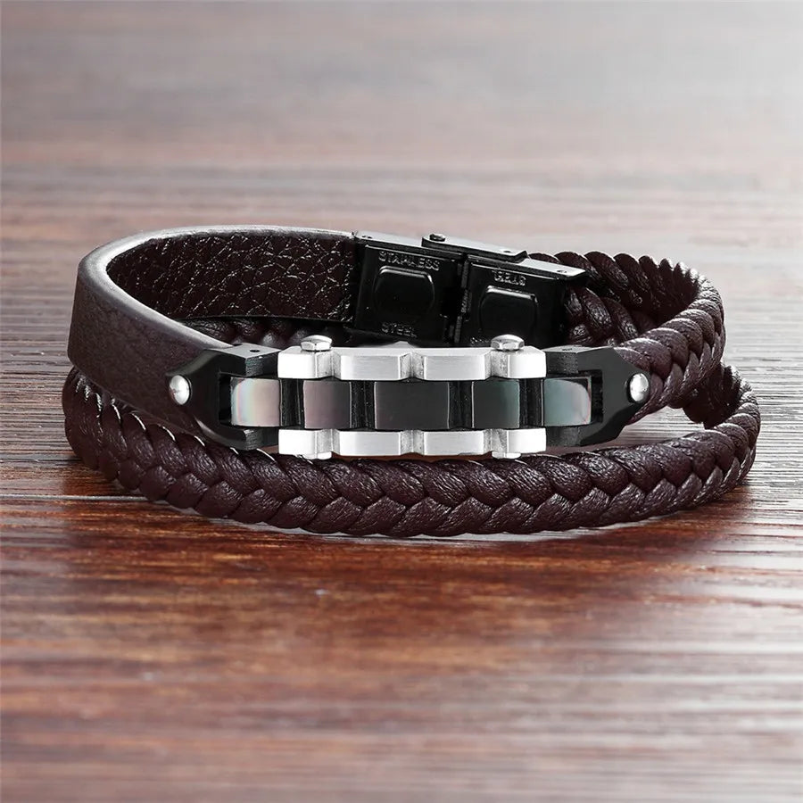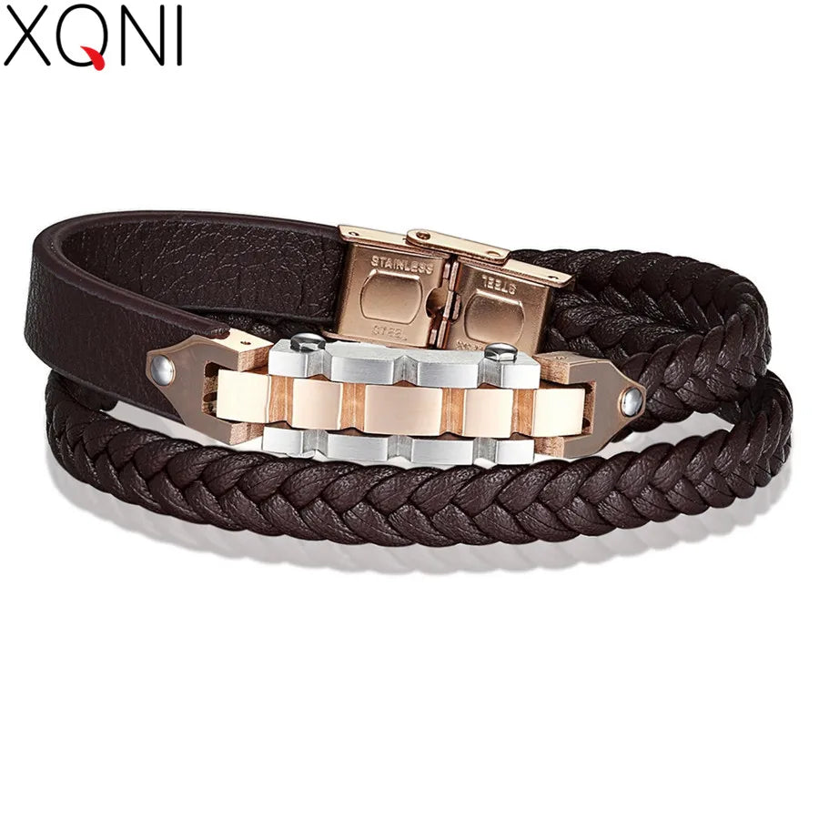 XQNI Bicycle Chain with Toggle-clasps Combination Stainless Steel Genuine Leather Bracelet For Men Brown Rope Chain For Gift